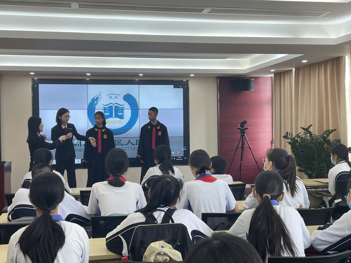 同學(xué)們?cè)诜ü僦淼囊龑?dǎo)下參觀了大鵬法庭,法官助理用通俗易懂的語(yǔ)言介紹了法庭設(shè)置、審判職能和審判流程,向同學(xué)們揭開(kāi)法庭的神秘面紗,讓同學(xué)們對(duì)法庭和審判有了直觀感受。大鵬新區(qū)政法辦工作人員對(duì)公檢法職能及相互關(guān)系進(jìn)行了介紹。針對(duì)同學(xué)們關(guān)心的問(wèn)題,法官助理通過(guò)以案說(shuō)法、體驗(yàn)式學(xué)法、視頻科普、提問(wèn)互動(dòng)等寓教于樂(lè)的授課方式作了專業(yè)解答,同學(xué)們豁然開(kāi)朗。