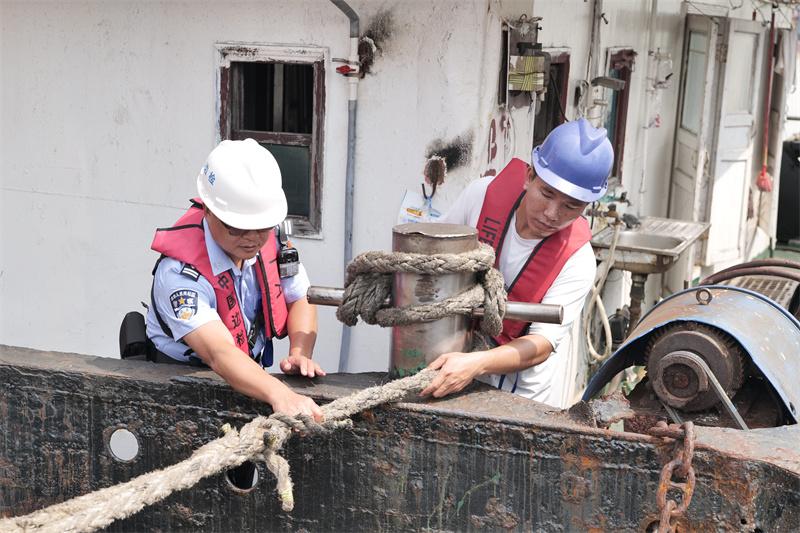 在強化船舶安全保障的基礎上,中山邊檢站聚焦口岸重點區(qū)域防御,組織執(zhí)勤警力深入口岸限定區(qū)域、集裝箱堆場、碼頭作業(yè)區(qū)等關鍵部位開展拉網(wǎng)式排查。民警們對防風設施、排水系統(tǒng)、電路設備等進行細致檢查,及時督促整改松動廣告牌、積水隱患點等問題,協(xié)助碼頭企業(yè)加固易受風雨影響的物資設備,從源頭降低事故風險。依托船訊網(wǎng)、智能監(jiān)控系統(tǒng)等科技平臺,邊檢站同步開展“線上”動態(tài)監(jiān)管,實時核查口岸及錨地船舶軌跡,嚴密防范臺風期間可能出現(xiàn)的非法出入境、擅自搭靠、違規(guī)上下輪等違法違規(guī)行為,確保特殊天氣下口岸管控不松懈。