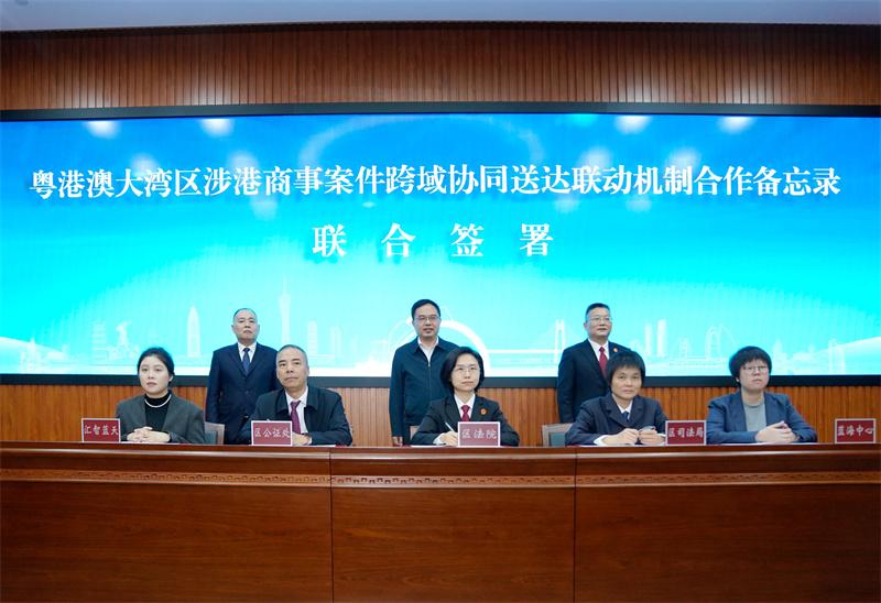潮涌珠江,灣區(qū)同心。12月17日上午,廣東省廣州市南沙區(qū)人民法院(廣東自由貿易區(qū)南沙片區(qū)人民法院)攜手廣州市南沙區(qū)司法局、廣州市南沙公證處、深圳市藍海法律查明和商事調解中心、廣州市匯智藍天國際法律與商事服務中心暨“一帶一路”域外法查明(廣州)中心,共同簽署《關于構建粵港澳大灣區(qū)涉港商事案件跨域協(xié)同送達聯(lián)動機制合作備忘錄》(以下簡稱《備忘錄》)。