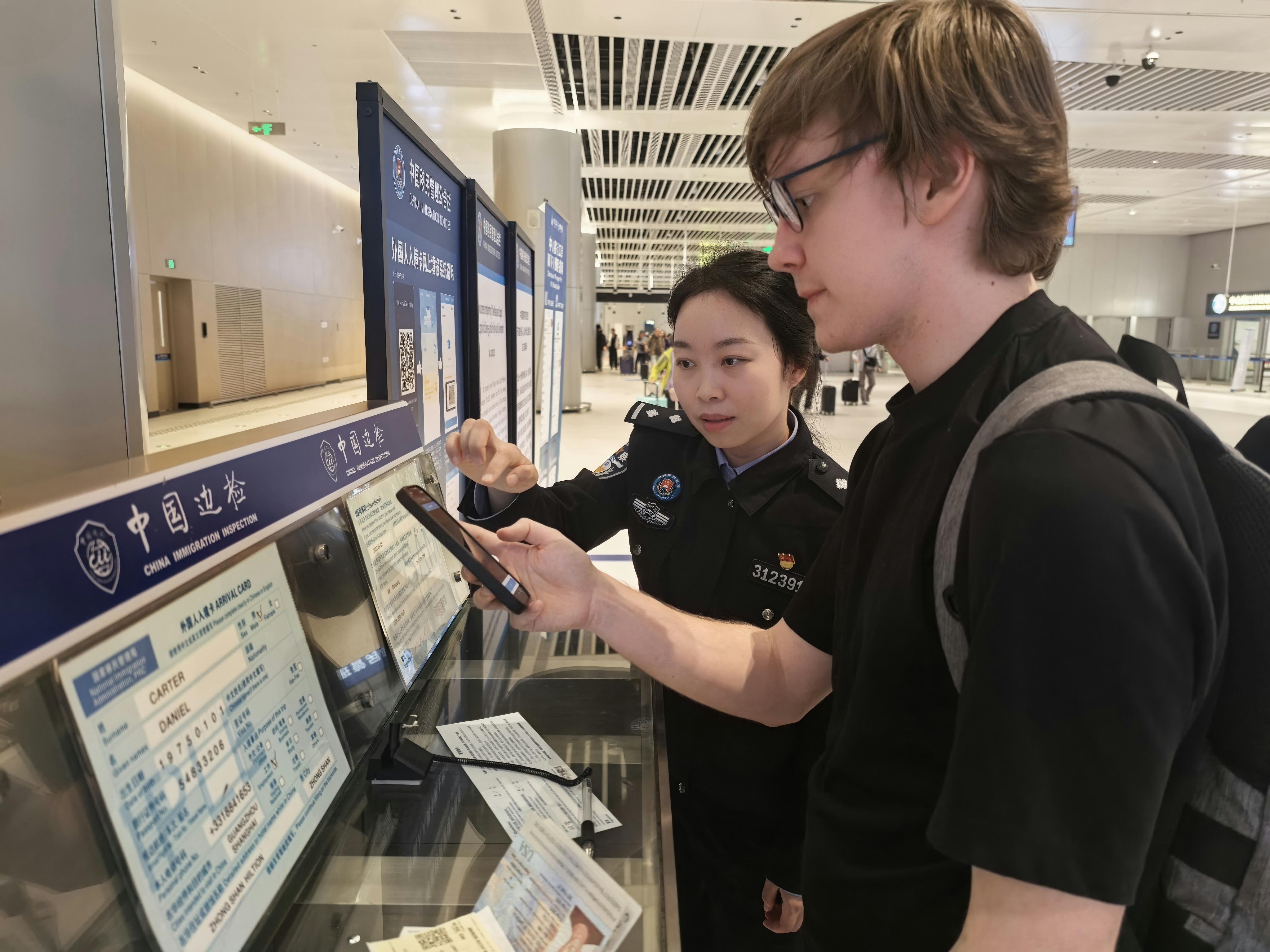 圖為中山邊檢站民警指引外籍旅客網(wǎng)上填報(bào)入境卡