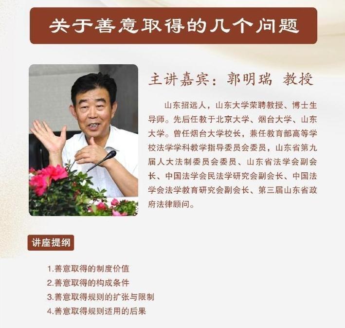 中國石油大學(xué)(華東)第八期 “石大人文講壇”邀請(qǐng)中國法學(xué)會(huì)民法學(xué)研究會(huì)副會(huì)長,煙臺(tái)大學(xué)原校長郭明瑞教授圍繞“關(guān)于善意取得的幾個(gè)問題”,將于4月15日在中國石油大學(xué)(華東)逸夫樓一樓報(bào)告廳開講。