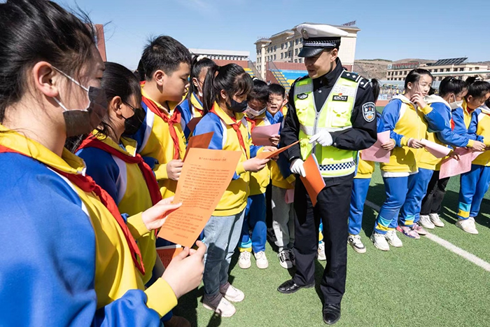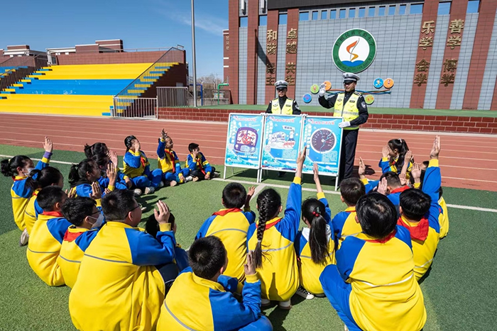 在經(jīng)棚民族實驗小學(xué),民警現(xiàn)場發(fā)放交通安全宣傳資料,講解交通安全知識,與學(xué)生們開展現(xiàn)場互動交流?;顒幼詈?,民警還帶領(lǐng)師生共同宣誓,共同倡議文明交通,安全出行。(宿海東)