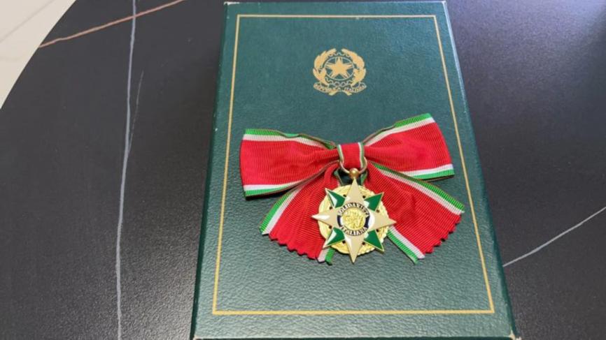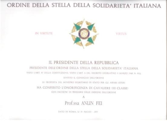 (意大利總統(tǒng)向費(fèi)安玲頒發(fā)的“意大利共和國騎士勛章”及證書。說明:證書中的“ANLIN FEI”應(yīng)為“ANLING FEI”。)
