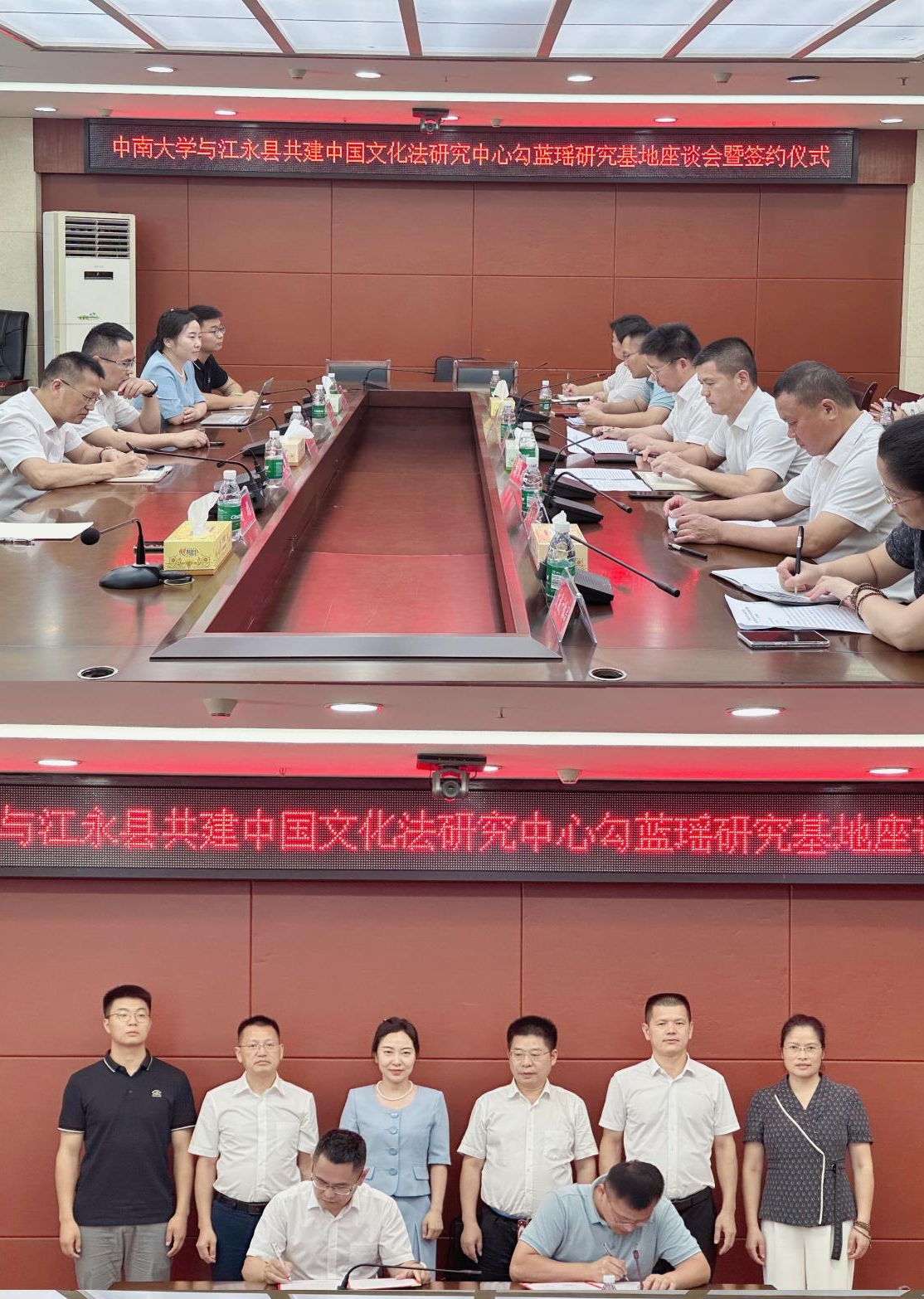 7月28日,“中南大學(xué)中國(guó)文化法研究中心勾藍(lán)瑤研究基地”在湖南省永州市江永縣蘭溪瑤族鄉(xiāng)勾藍(lán)瑤寨揭牌并簽署共建勾藍(lán)瑤研究基地合作協(xié)議,中共江永縣委書記唐德榮,縣委常委、宣傳部長(zhǎng)高厚德,副縣長(zhǎng)蔣劍平,中南大學(xué)法學(xué)院院長(zhǎng)許中緣,中國(guó)文化法研究中心執(zhí)行主任易玲、法學(xué)院教授唐東楚、講師郭壬癸以及縣委各部門負(fù)責(zé)人出席座談會(huì)及簽約儀式。