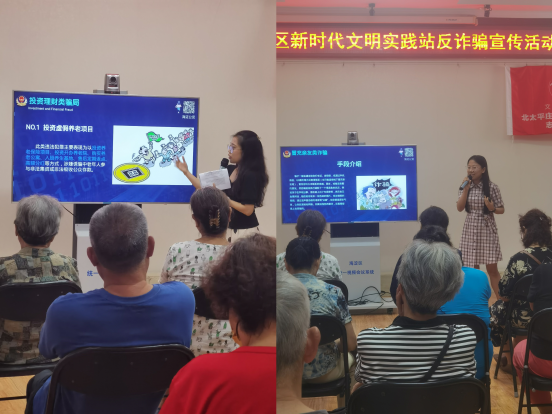 宣講團(tuán)成員王舒琦、李成秀在北京市海淀區(qū)北太平莊街道明光北里社區(qū)的社區(qū)活動(dòng)中為老年人們進(jìn)行了防范養(yǎng)老詐騙宣傳。兩位同學(xué)結(jié)合類型分析與實(shí)務(wù)案例,重點(diǎn)介紹了誘導(dǎo)消費(fèi)類、投資理財(cái)類、養(yǎng)老保險(xiǎn)類等典型騙局的詐騙方式,分享了針對性的防范路徑與預(yù)防措施,并給出了具體的防范建議。兩位同學(xué)的講解幫助老年人充分認(rèn)識到防范詐騙的重要性,樹立了反詐意識,了解了防詐知識。