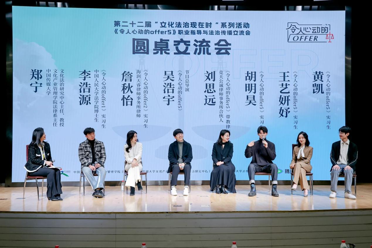 圓桌交流環(huán)節(jié)由中國傳媒大學(xué)文化產(chǎn)業(yè)管理學(xué)院法律系主任、文化法治研究中心主任鄭寧主持。與會嘉賓圍繞參加節(jié)目的收獲、個人選擇和成長的心路歷程、如何提升職場競爭力、對在校生的求職建議以及如何打造職場觀察類綜藝節(jié)目等話題進(jìn)行了交流分享,就《令人心動的offer5》的社會價值、求職經(jīng)驗、如何提升自身能力等話題為同學(xué)們答疑解惑,并提出務(wù)實建議。