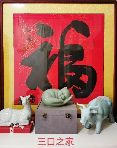 毫無(wú)疑問(wèn),正是這件作品隱含的濃烈親情元素和快樂(lè)因子,深深吸引并打動(dòng)了我,才最終成全了這筆交易,甚至讓我一不做二不休,干脆還買(mǎi)下了自己和夫人的生肖作品——羊和牛。返京后,我們將這三件清一色吃素的屬相工藝品,和家中原有的一幅大紅“?!弊?jǐn)[在一起,便組合出一幅別有情趣的“和諧家園風(fēng)景圖”:幸福一家人、快樂(lè)一家親。
