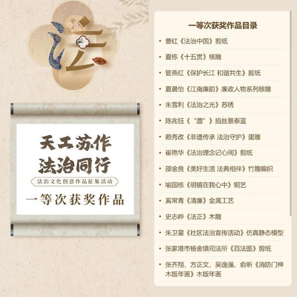 為深入實(shí)施蘇州市“八五”普法規(guī)劃,推動(dòng)法治文化與非物質(zhì)文化遺產(chǎn)深度融合發(fā)展,今年,江蘇省蘇州市委宣傳部、蘇州市司法局、蘇州市文化廣電和旅游局、蘇州市文學(xué)藝術(shù)界聯(lián)合會(huì)以“天工蘇作 法治同行”為主題在全市開(kāi)展了法治文化創(chuàng)意作品征集活動(dòng),積極探索創(chuàng)新法治宣傳形式,讓法治精神和法治信仰深入人心。