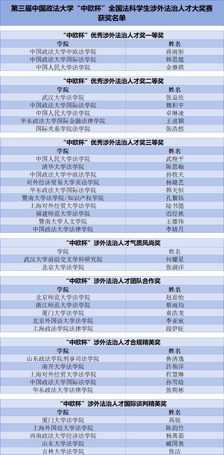 經(jīng)過激烈角逐,最終來自全國28所法學院系的35名同學脫穎而出。復賽共評選出:“中歐杯”優(yōu)秀涉外法治人才一等獎3名、二等獎5名、三等獎10名,“涉外法治人才氣質(zhì)風尚獎”2名,“涉外法治人才團隊合作獎”5名,“涉外法治人才合規(guī)精英獎”5名,“涉外法治人才國際談判精英獎”5名。
