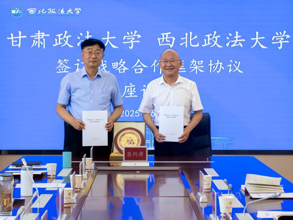 本報(bào)訊 記者孫立昊洋 6月5日,西北政法大學(xué)與甘肅政法大學(xué)戰(zhàn)略合作框架協(xié)議簽約儀式暨座談會(huì)在西北政法大學(xué)舉行。西北政法大學(xué)校長(zhǎng)范九利、甘肅政法大學(xué)校長(zhǎng)鄭高鍵出席簽約儀式。與會(huì)人員圍繞學(xué)科建設(shè)、科學(xué)研究、人才培養(yǎng)、師資隊(duì)伍建設(shè)、國(guó)際合作等方面展開深入交流。