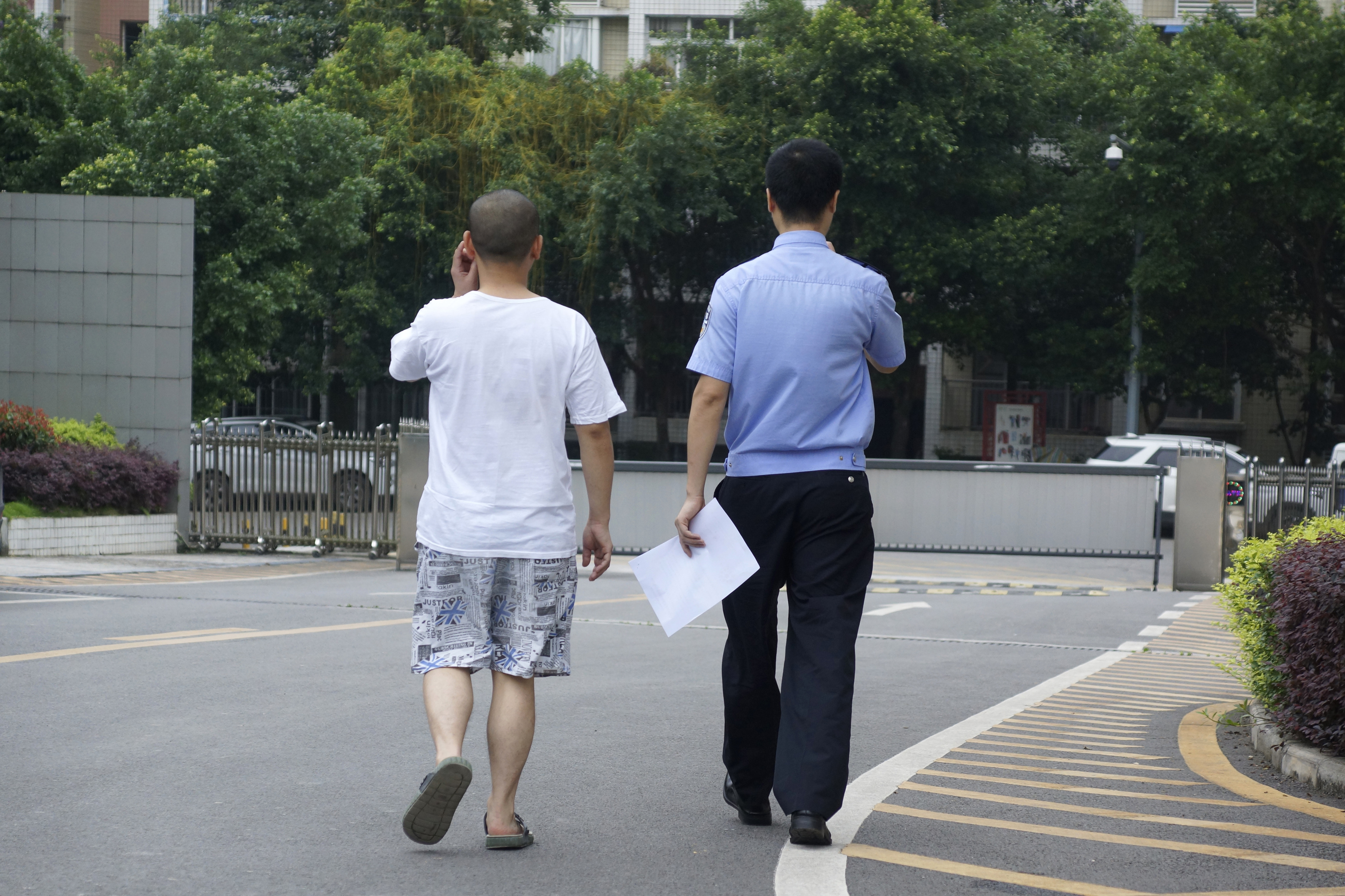 戒毒所大門口,一名戒毒人員兩年的隔離戒毒期滿,在民警護送下走出戒毒區(qū),走向新的生活