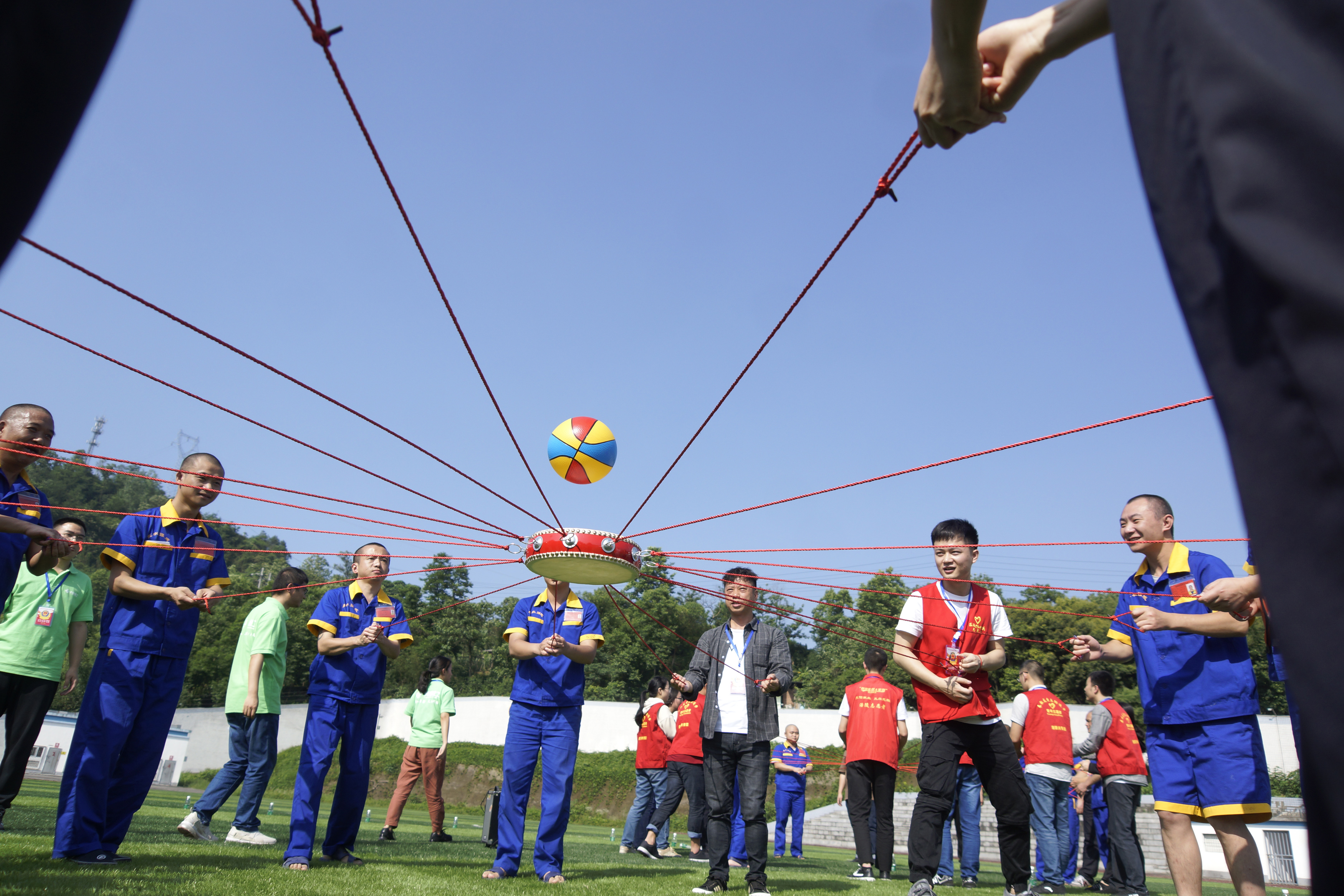 運動場草坪,一支禁毒志愿者隊伍來到戒毒所開展幫教活動,與戒毒人員同做趣味游戲