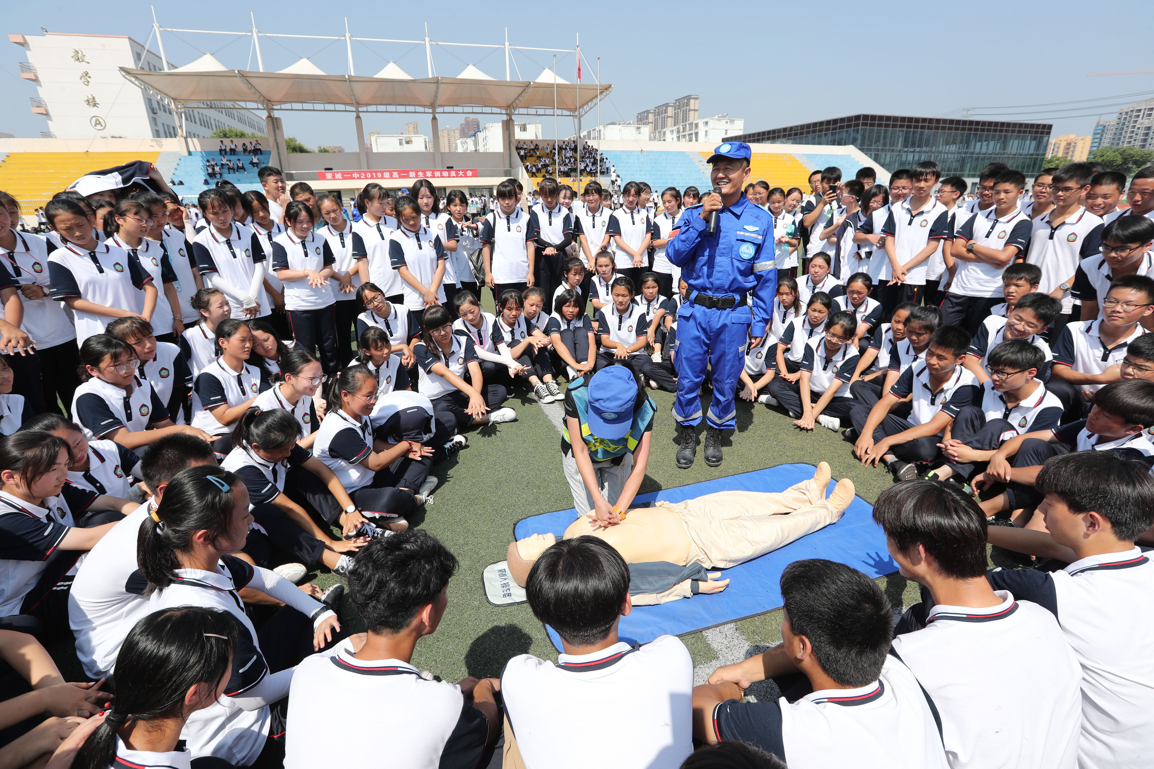 8月29日,安徽省蒙城縣第一中學(xué)操場(chǎng),志愿者向高一新生演示介紹心腹復(fù)蘇急救要領(lǐng)。