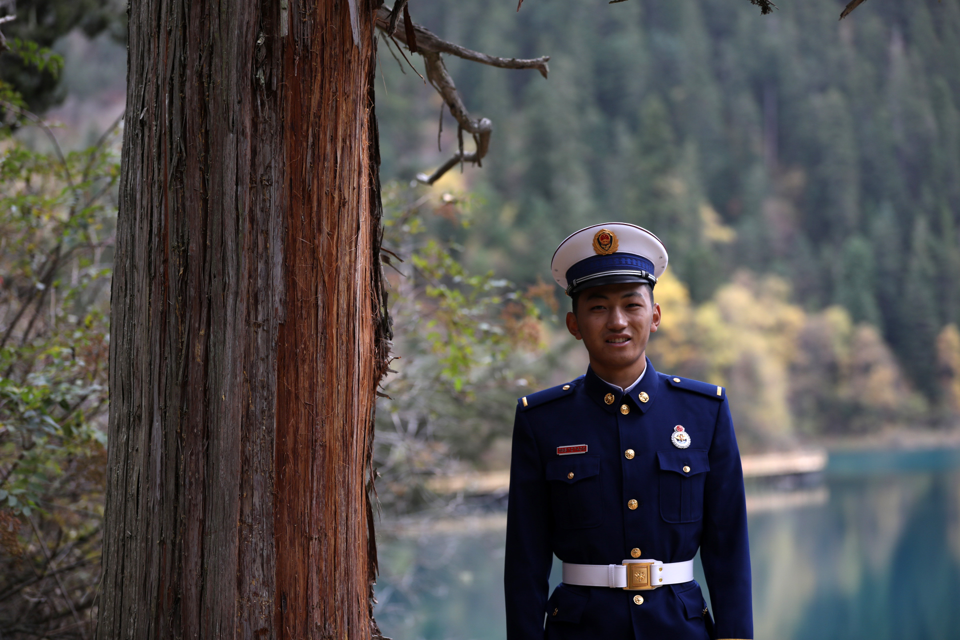 廖海州和中隊長倪磊并肩巡邏在五花海景點的棧道上,“前年地震,我們從這里抬出來了好幾個受傷游客.....”這對同年入伍的老隊員 最能聊到一起。