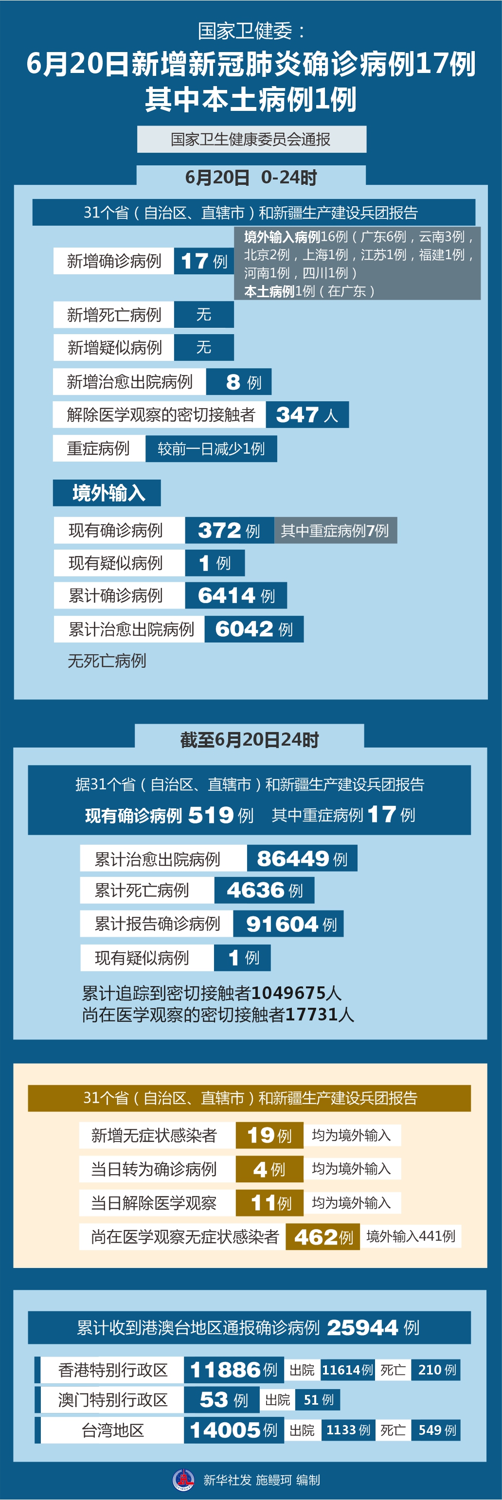圖表:國家衛(wèi)健委:6月20日新增新冠肺炎確診病例17例 其中本土病例1例