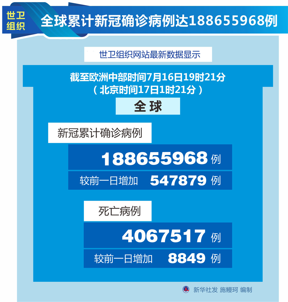 圖表:世衛(wèi)組織:全球累計新冠確診病例達188655968例