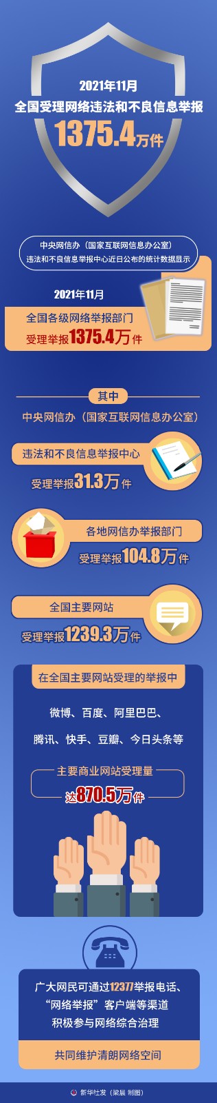 中央網(wǎng)信辦(國(guó)家互聯(lián)網(wǎng)信息辦公室)違法和不良信息舉報(bào)中心近日公布的統(tǒng)計(jì)數(shù)據(jù)顯示,今年11月,全國(guó)各級(jí)網(wǎng)絡(luò)舉報(bào)部門受理舉報(bào)1375.4萬件。