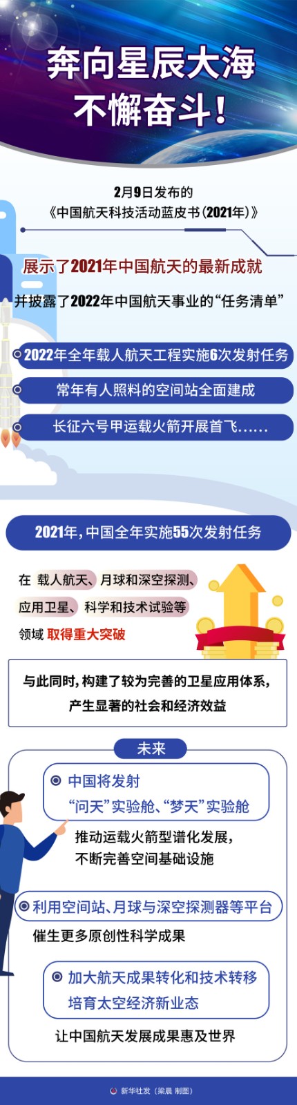 2022年全年載人航天工程實(shí)施6次發(fā)射任務(wù),常年有人照料的空間站全面建成,長征六號甲運(yùn)載火箭開展首飛……2月9日發(fā)布的《中國航天科技活動(dòng)藍(lán)皮書(2021年)》,展示了2021年中國航天的最新成就,并披露了2022年中國航天事業(yè)的“任務(wù)清單”,一項(xiàng)項(xiàng)舉世矚目的成就和新計(jì)劃催人奮進(jìn)。