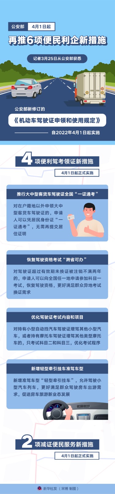 新華社記者3月25日從公安部獲悉,公安部新修訂的《機(jī)動(dòng)車駕駛證申領(lǐng)和使用規(guī)定》自2022年4月1日起實(shí)施。新修訂的部門規(guī)章對(duì)公安部近年來(lái)已推出的交管改革措施予以固化,推進(jìn)改革成果制度化、法治化,并回應(yīng)群眾新要求新期待,再推出6項(xiàng)便民利企新措施。