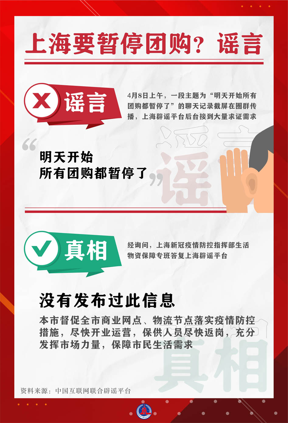 據(jù)上海網(wǎng)絡(luò)辟謠平臺消息:4月8日上午,一段主題為“明天開始所有團(tuán)購都暫停了”的聊天記錄截屏在圈群傳播,上海辟謠平臺后臺接到大量求證需求。