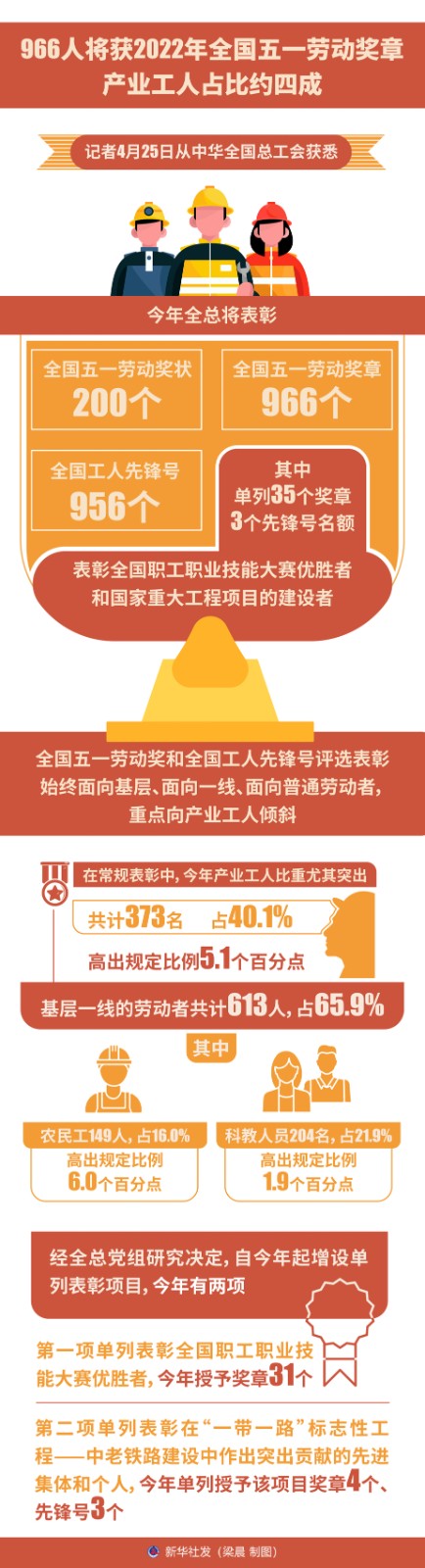 記者4月25日從中華全國總工會獲悉,今年全總將表彰全國五一勞動獎狀200個、全國五一勞動獎章966個、全國工人先鋒號956個,其中單列35個獎章、3個先鋒號名額,表彰全國職工職業(yè)技能大賽優(yōu)勝者和國家重大工程項目的建設者。