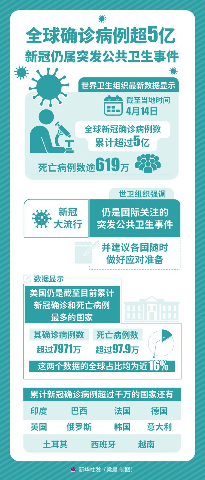世界衛(wèi)生組織最新數(shù)據(jù)顯示,截至4月14日全球新冠確診病例數(shù)累計超過5億,死亡病例數(shù)逾619萬。雖然全球新增確診和死亡病例數(shù)近期持續(xù)下降,但世衛(wèi)組織強調(diào),新冠大流行仍是國際關(guān)注的突發(fā)公共衛(wèi)生事件,并建議各國隨時做好應(yīng)對準(zhǔn)備。