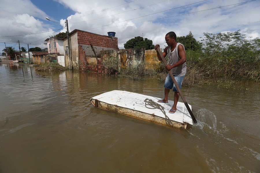 6月2日,在巴西伯南布哥州累西腓,一名男子劃泡沫筏在洪水中前行。
