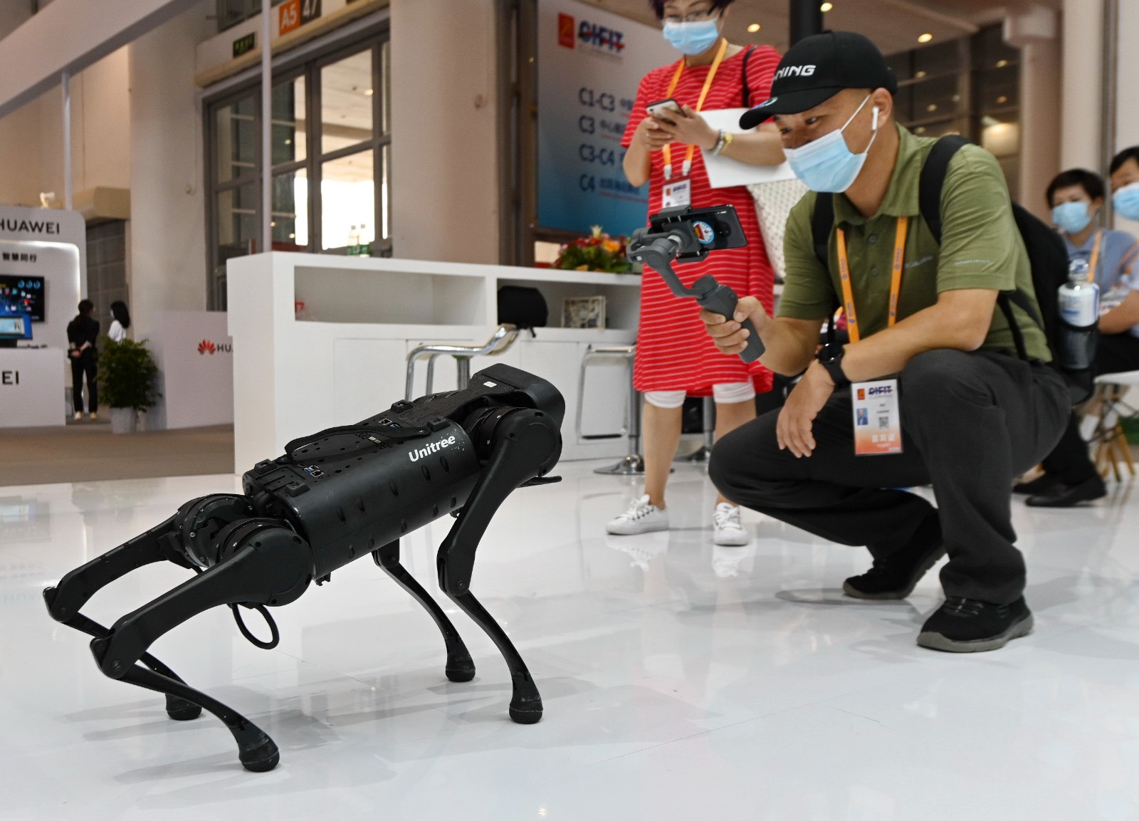 2021年9月8日,參觀者在2021金磚國(guó)家新工業(yè)革命展上拍攝展出的智能機(jī)器狗。