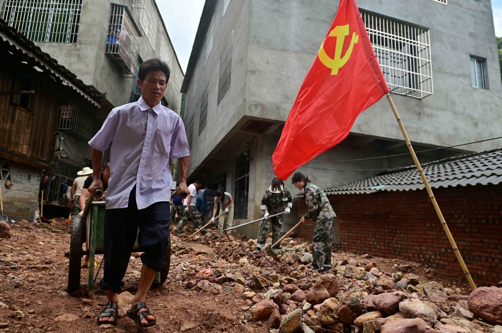 6月25日,在從江縣東朗鎮(zhèn)黨都村,黨員志愿者王老春(前)用手推車搬運石頭。