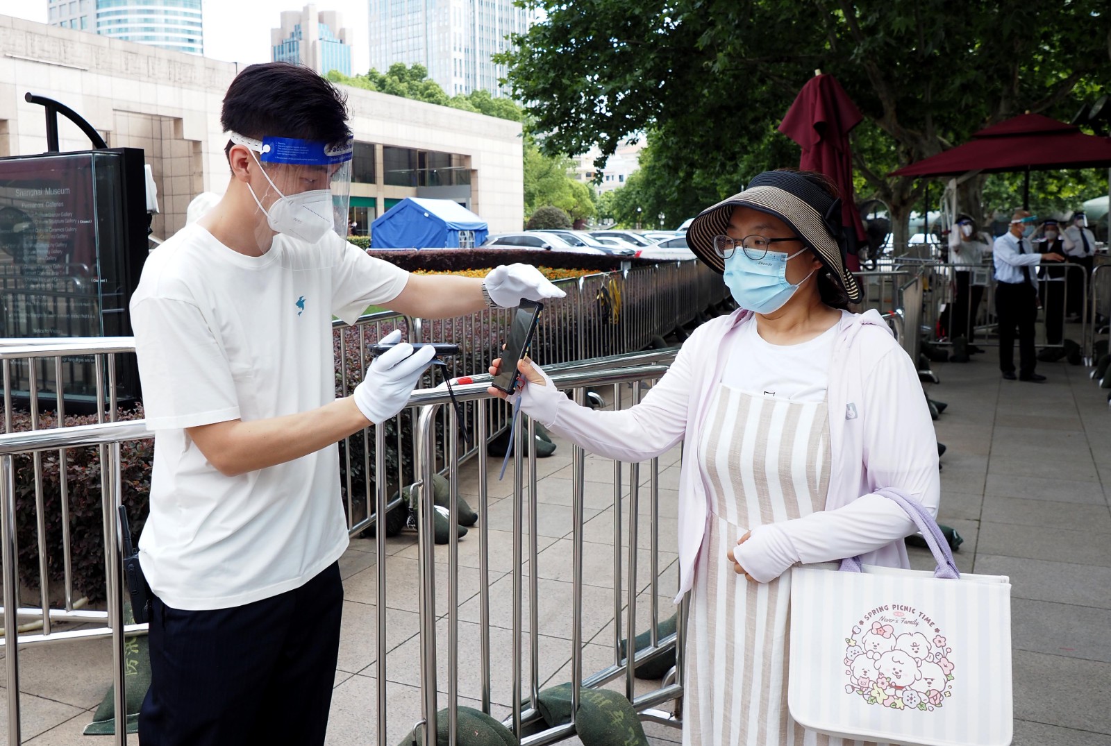 7月1日,上海博物館恢復對公眾開放。觀眾在查驗“隨申碼”后入場參觀。