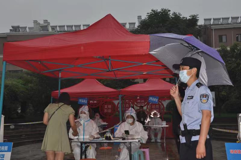 圖為7月5日,故黃派出所民警楊勍在梨都明珠小區(qū)核酸檢測(cè)現(xiàn)場(chǎng)冒雨值勤。