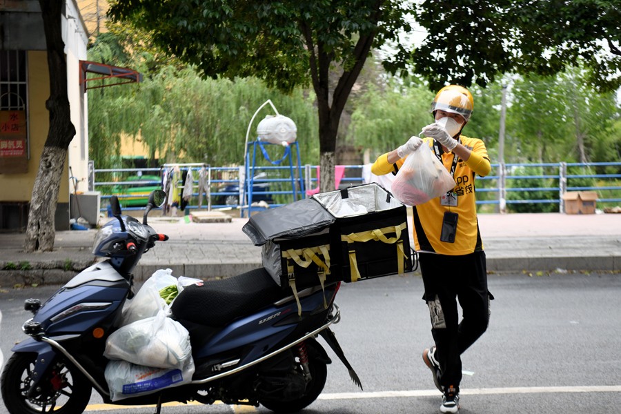今年27歲的譚章夢(mèng)是安徽省宿州市泗縣的一名外賣小哥。泗縣本輪新冠肺炎疫情發(fā)生后,譚章夢(mèng)主動(dòng)向公司申請(qǐng)加入物資保供組,忙碌在疫情防控一線,為一家大型保供商超提供配送服務(wù),保障米面蔬菜等生活必需物資的配送。