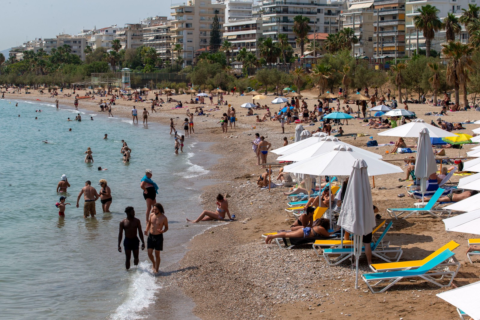 6月22日,在希臘雅典郊區(qū)海灘,人們?cè)谟斡鞠睢?/p>