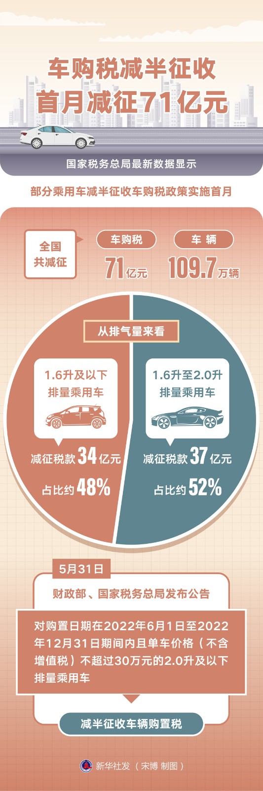自6月1日起實(shí)施的部分乘用車減半征收車購(gòu)稅政策已經(jīng)“滿月”。國(guó)家稅務(wù)總局最新數(shù)據(jù)顯示,政策實(shí)施首月,全國(guó)共減征車購(gòu)稅71億元,減征車輛109.7萬(wàn)輛。從排氣量來(lái)看,1.6升及以下排量乘用車減征稅款34億元,占比約48%;1.6升至2.0升排量乘用車減征稅款37億元,占比約52%。