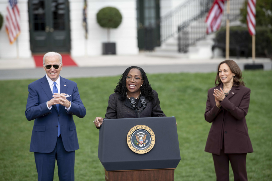 這是4月8日,凱坦吉·布朗·杰克遜(中)在美國華盛頓白宮與美國總統(tǒng)拜登(左)、副總統(tǒng)哈里斯共同出席活動(資料照片)。