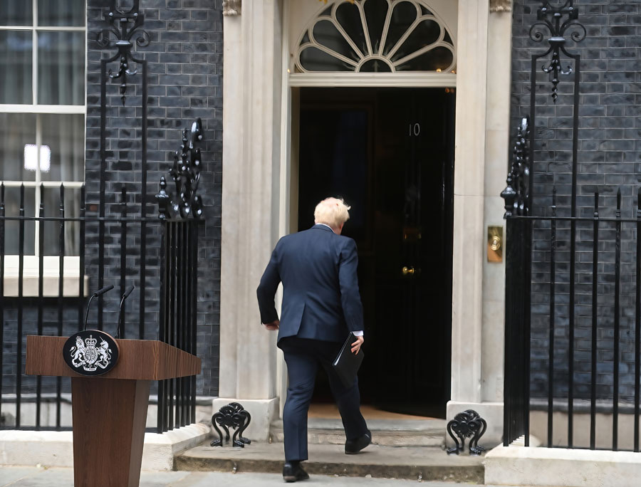 7月7日,英國首相鮑里斯·約翰遜在倫敦唐寧街10號門前發(fā)表講話后返回室內(nèi)。