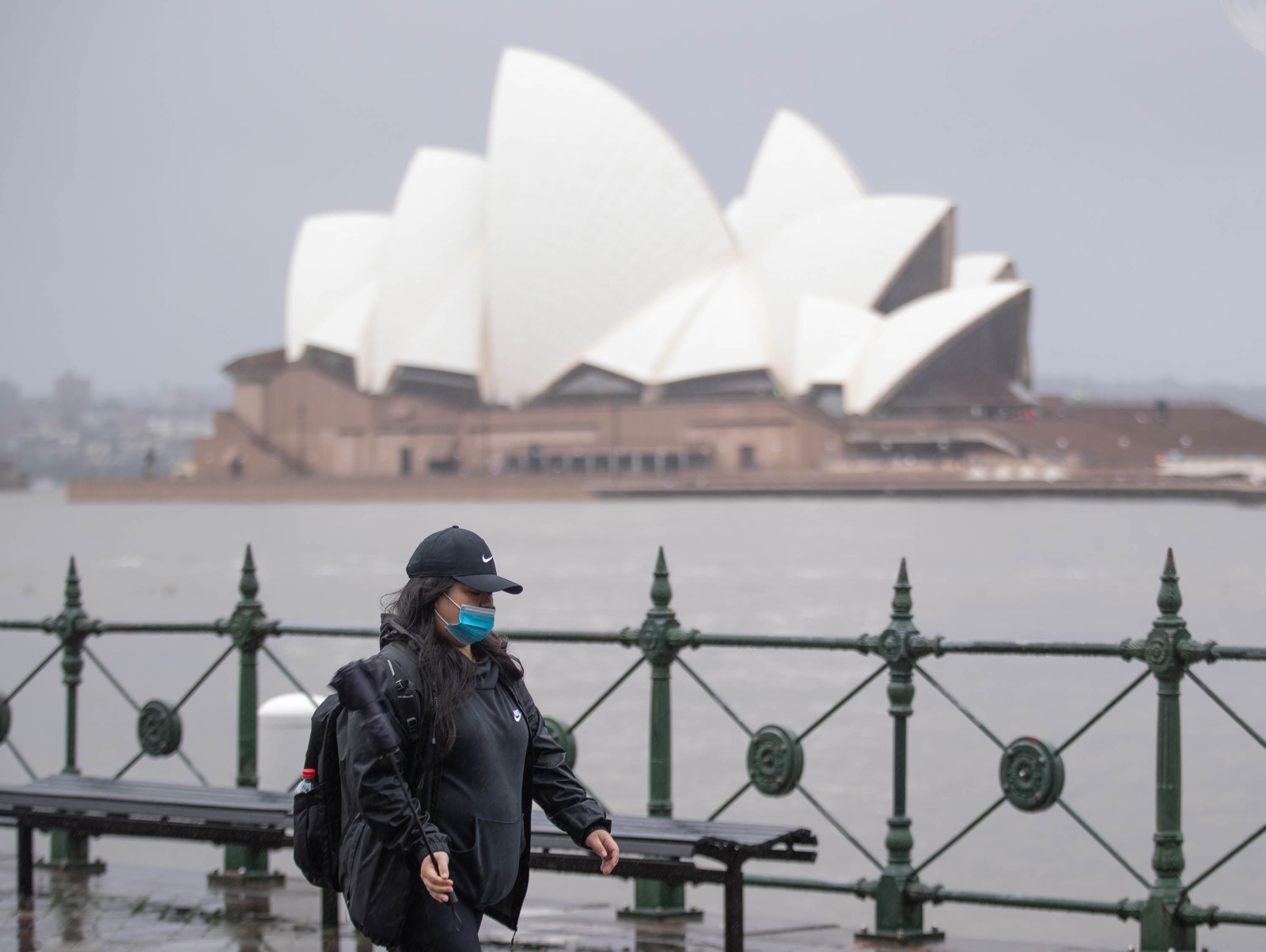 7月6日,在澳大利亞悉尼,一名女子佩戴口罩走過悉尼歌劇院。