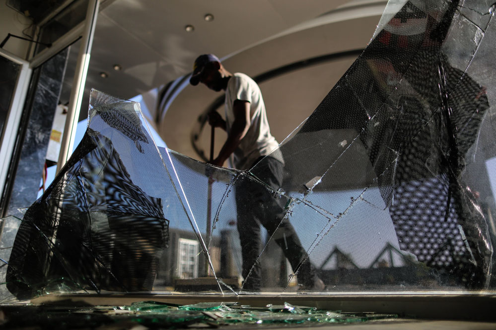 7月16日,一名巴勒斯坦男子在加沙地帶清理空襲過后破碎的玻璃。