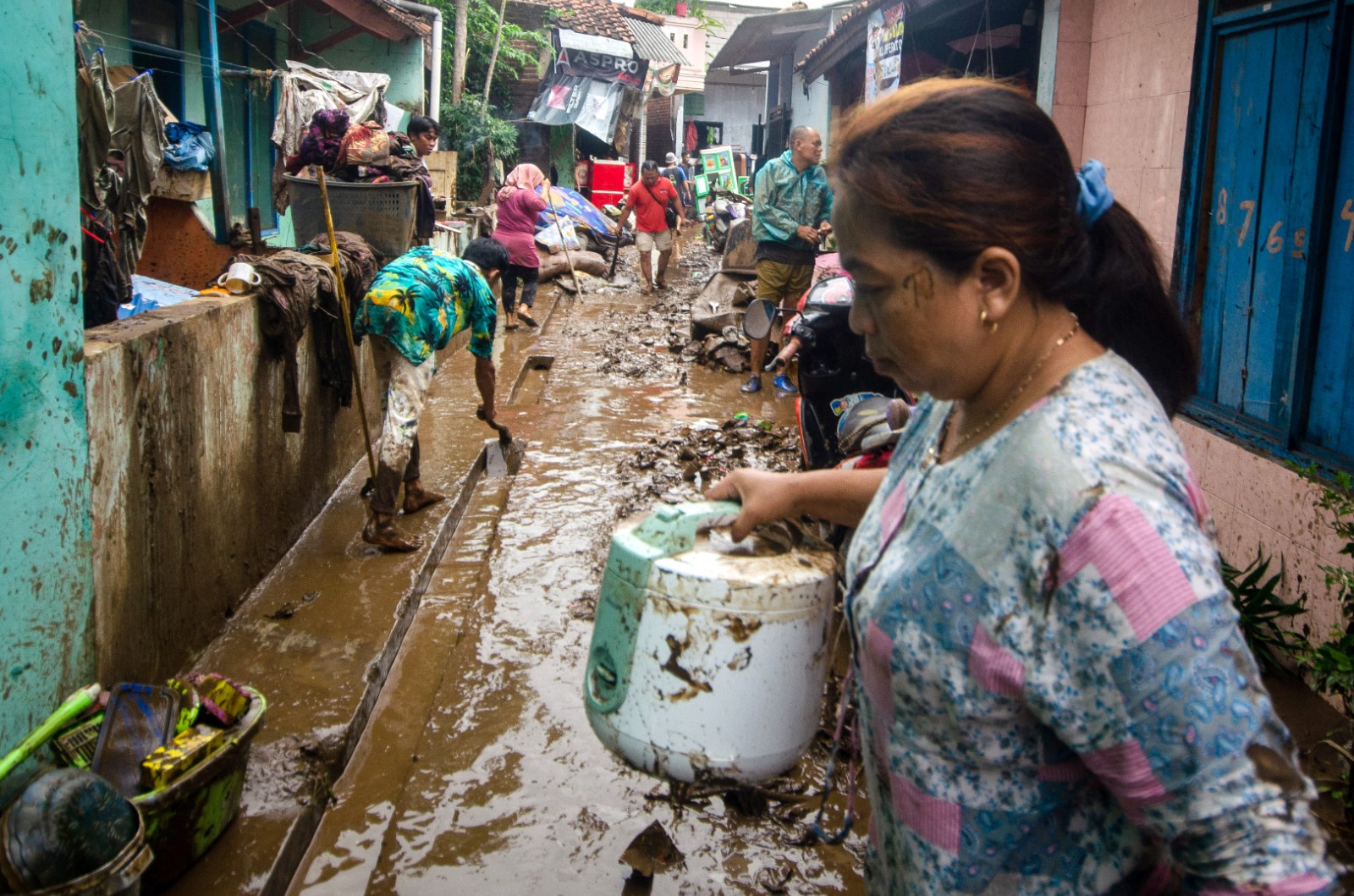 7月16日,在印尼西爪哇省加魯特,當(dāng)?shù)鼐用袂謇肀缓樗忠u的房屋。