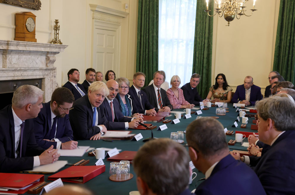 7月19日,約翰遜(前左三)在英國(guó)倫敦首相府主持他卸任前最后一次內(nèi)閣會(huì)議。