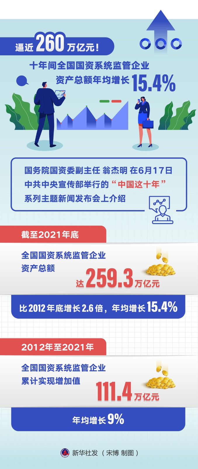 國務(wù)院國資委副主任翁杰明在6月17日中共中央宣傳部舉行的“中國這十年”系列主題新聞發(fā)布會上介紹,截至2021年底,全國國資系統(tǒng)監(jiān)管企業(yè)資產(chǎn)總額達(dá)259.3萬億元,比2012年底增長2.6倍,年均增長15.4%;2012年至2021年,全國國資系統(tǒng)監(jiān)管企業(yè)累計實現(xiàn)增加值111.4萬億元,年均增長9%。
