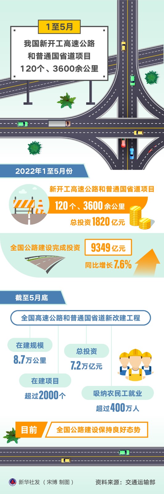 在6月27日舉行的國新辦發(fā)布會上,趙沖久表示,1至5月,全國公路建設完成投資9349億元,同比增長7.6%。截至5月底,全國高速公路和普通國省道新改建工程在建規(guī)模8.7萬公里,在建項目超過2000個,總投資7.2萬億元,吸納農(nóng)民工就業(yè)超過400萬人。“目前,全國公路建設保持良好態(tài)勢?!?/p>