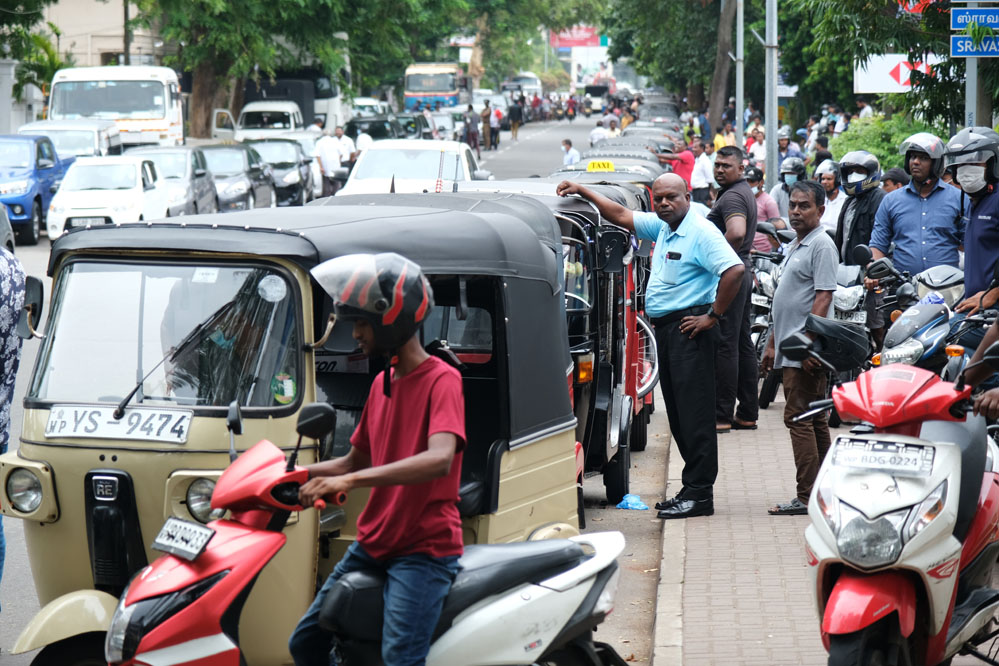 7月21日,在斯里蘭卡首都科倫坡,人們?cè)谂抨?duì)加油。