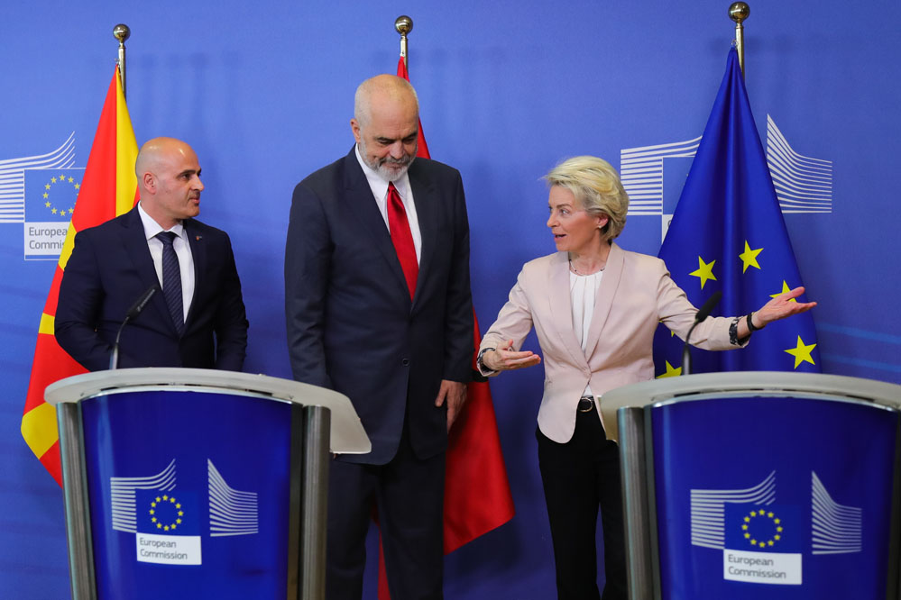 在推遲了近兩年后,歐盟19日正式與阿爾巴尼亞和北馬其頓開啟入盟談判。當(dāng)天,歐盟與阿爾巴尼亞和北馬其頓在布魯塞爾召開政府間會議。歐盟委員會主席馮德萊恩、歐盟輪值主席國捷克總理菲亞拉、阿爾巴尼亞總理拉馬和北馬其頓總理科瓦切夫斯基在會前舉行了聯(lián)合記者會。