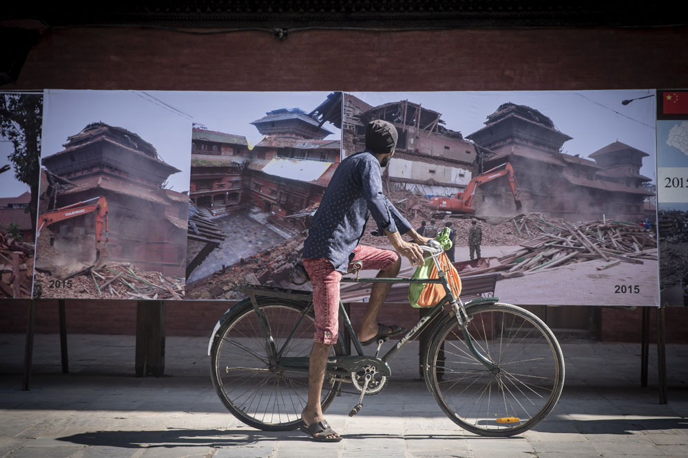 7月15日,在尼泊爾加德滿都,行人駐足瀏覽九層神廟建筑群在2015年尼泊爾大地震中受損后的圖片。