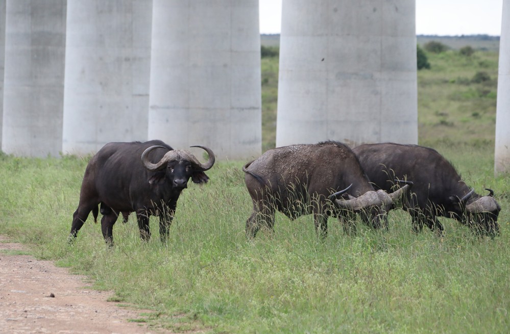 幾頭水牛在肯尼亞內羅畢國家公園特大橋下吃草(2021年5月19日攝)。