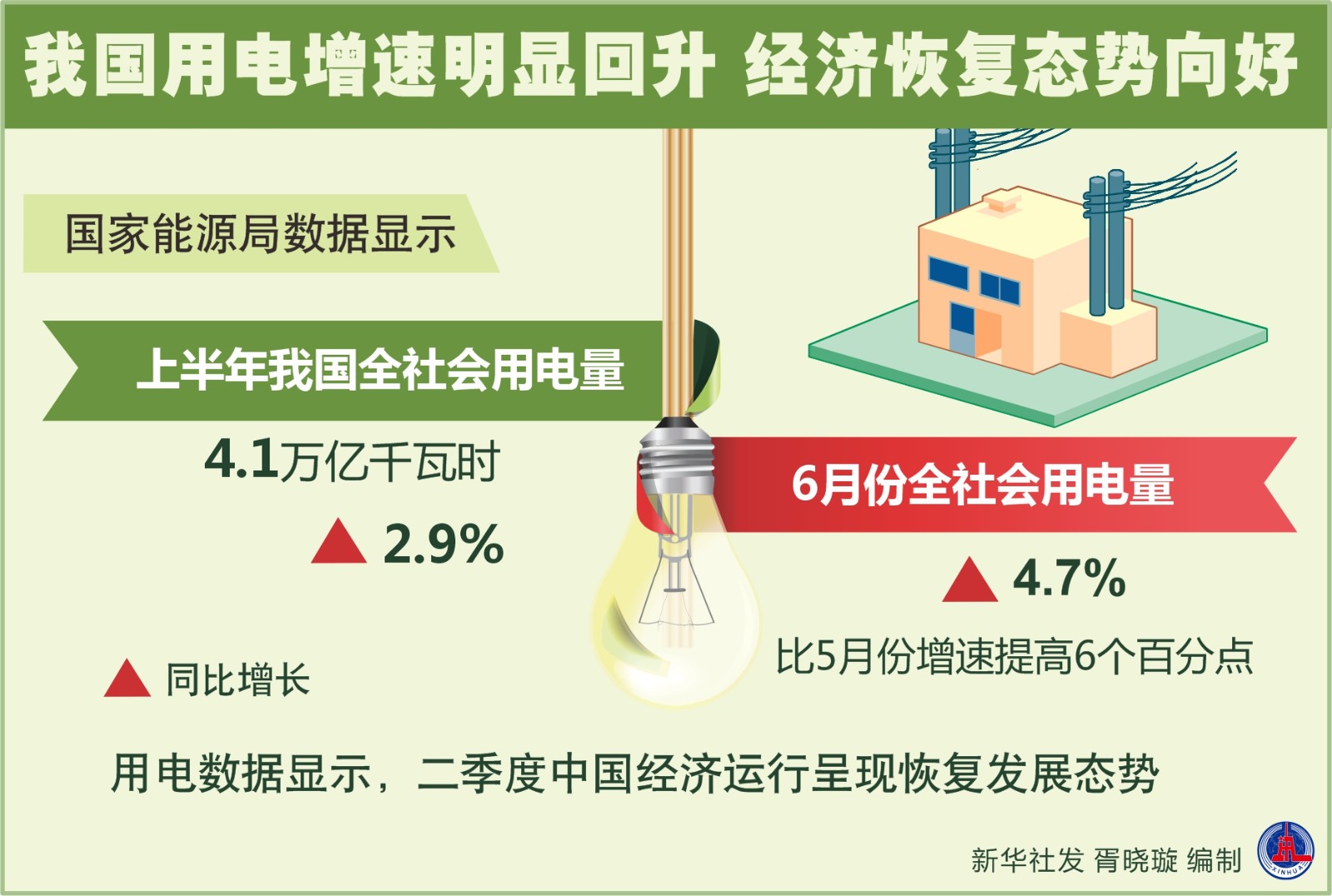 國家能源局?jǐn)?shù)據(jù)顯示,上半年我國全社會用電量4.1萬億千瓦時(shí),同比增長2.9%。6月份全社會用電量同比增長4.7%,比5月份增速提高6個(gè)百分點(diǎn)。用電數(shù)據(jù)顯示,二季度中國經(jīng)濟(jì)運(yùn)行呈現(xiàn)恢復(fù)發(fā)展態(tài)勢。