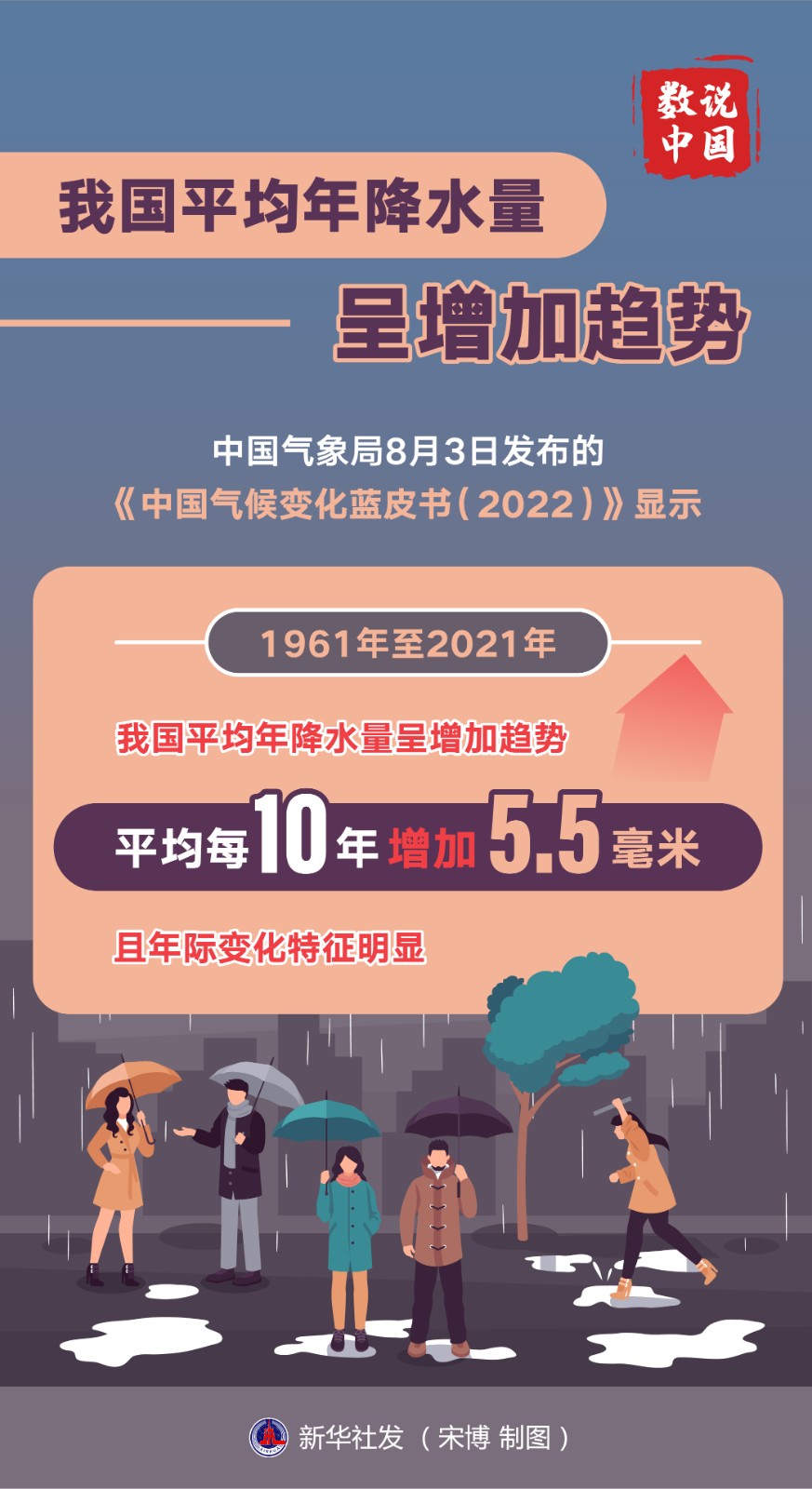 中國(guó)氣象局8月3日發(fā)布的《中國(guó)氣候變化藍(lán)皮書(shū)(2022)》顯示,1961年至2021年,我國(guó)平均年降水量呈增加趨勢(shì),平均每10年增加5.5毫米,且年際變化特征明顯。