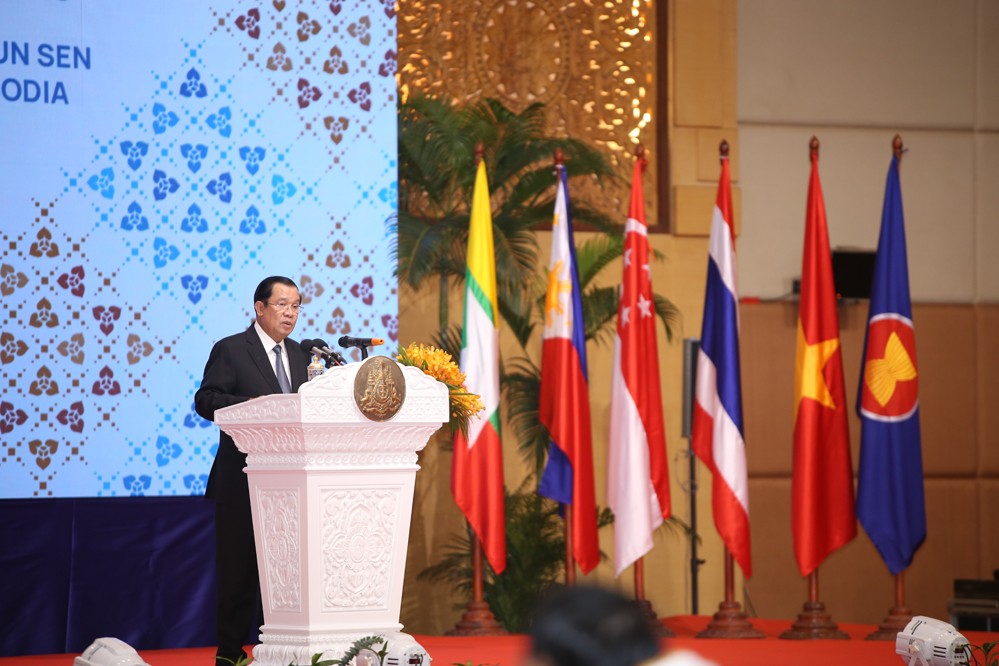 8月3日,柬埔寨首相洪森在首都金邊舉行的東盟外長會(huì)議上發(fā)言。
