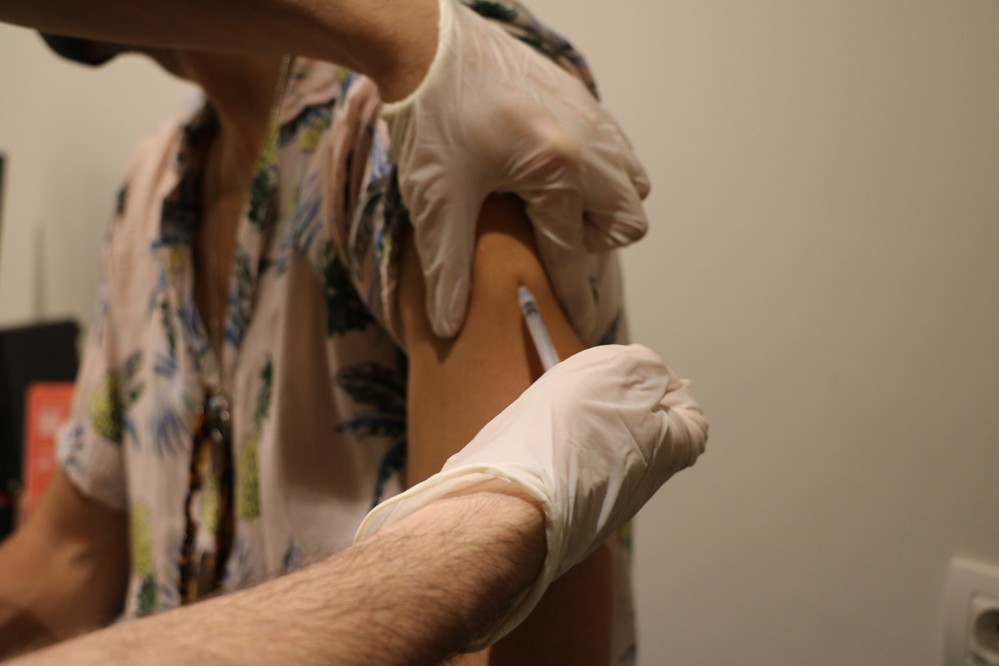8月3日,一名男子在西班牙巴塞羅那一家診所內(nèi)接種猴痘疫苗。